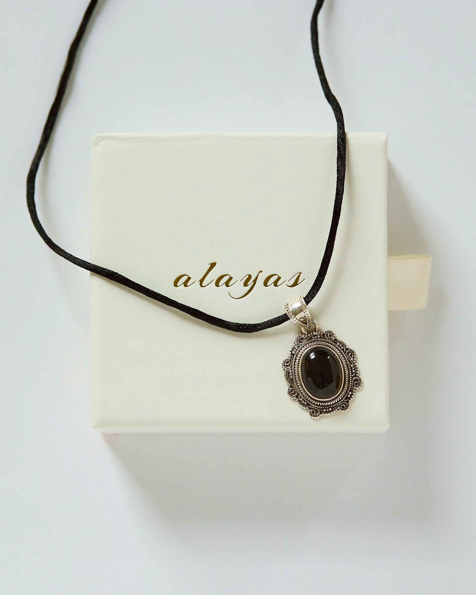 Black chalcedony, prized for its deep, lustrous finish, takes center stage in this vintage-inspired pendant. The stone is secured in an ornate setting. The accompanying satin cord provides a soft, refined drape against the skin while ensuring comfortable everyday wear.